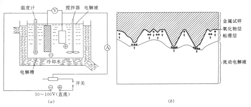 (a) 電解拋光裝置 (b)電解拋光原理。試樣接陽極,不銹鋼板作陰極,放入電解液中,接通電源后,陽極發生溶解,金屬離子進入溶液中。