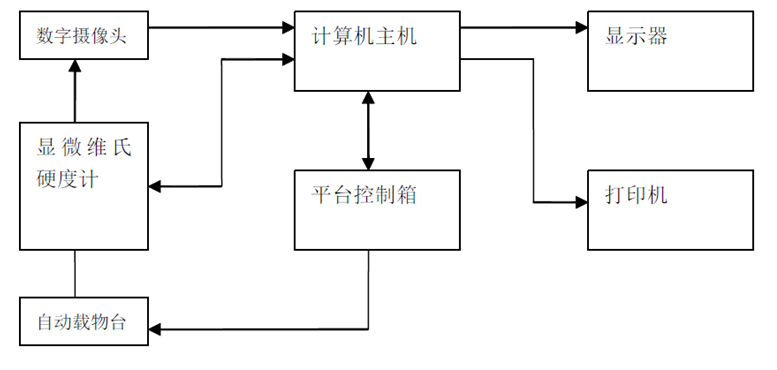 計算機主機通過 RS232 串口,控制硬度計的動作并接收硬度計的相應信息;計算機主機通過 RS232 串口,控制平臺控制箱,并通過平臺控制箱,控制自動載物臺移動并接收相應信息;維氏硬度計所壓的壓痕的光學信號,通過數字攝像頭成像在計算機顯示器上,再通過自動、手動讀數,測得維氏硬度值。